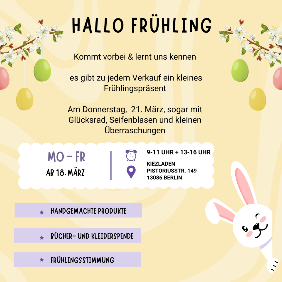 09:30 - 15:00 Uhr im Kiezladen, Pistoriusstraße 149, 13086 Berlin - mit Glücksrad, Seifenblasen und kleinen Überraschungen ;-)