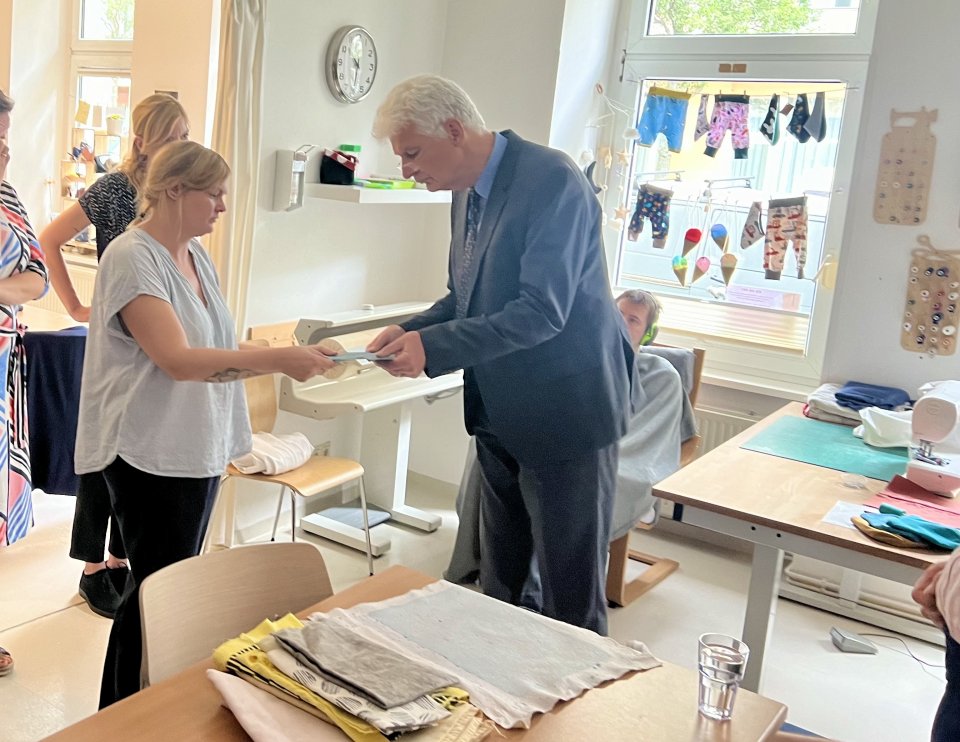 Im Beschäftigungs- und Förderbereich (BFB) in der Schreinerstraße wurde die Gruppe von Dr. Benjamin Bell, Geschäftsführer der leben lernen gGmbH und Katja Liebal, Bereichsleiterin BFB begrüßt. Nach einer kurzen Vorstellung unserer Angebote und der konzeptionellen Ausrichtung zeigten Beschäftigte und Mitarbeitende den Besuchern am Beispiel einer Glückwunschkarte, wie in einzelnen Teilschritten jeder Beschäftigte in die Herstellung handgemachter Produkte einbezogen wird.
