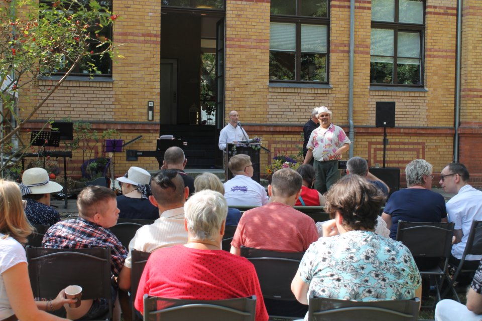 Nach diesem kraftvollen Auftakt folgten verschiedene Festreden, die die Dankbarkeit, Wichtigkeit und Wertschätzung unserer gemeinsamen Arbeit zum Ausdruck brachten. Dankesworte gingen an unsere ehemalige Geschäftsführerin Frau Jonas, die am 31.08.2024 ihren letzten Tag bei leben lernen hatte. Gleichzeitig wurde von unserem Geschäftsführer Herrn Dr. Bell, Frau Liebal als neue Geschäftsführerin an seiner Seite willkommen geheißen. Frau Liebal beglückwünschte ihre Nachfolgerin Frau Gandre in der Position als Leitung BFB sehr herzlich. Nach ein paar Worten von der Gesamtleitung Wohnen Herrn Schuster, der die Gelegenheit nutze sich auch noch einmal kurz vorzustellen, kam die Vorsitzende des Bewohnerbeirates Frau Albrecht zu Wort. Sie bedankte sich für die Arbeit der Assitent*innen und eröffnete das Fest.