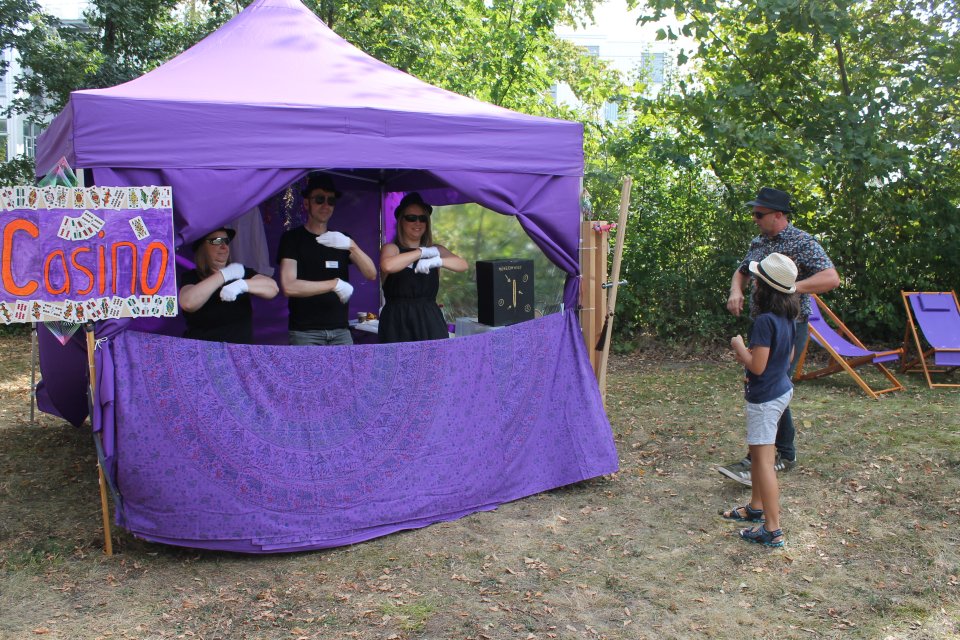 Neben dem musikalischen Programm gab es zahlreiche Aktivitäten, die großen Anklang fanden. Am Siebdruckstand konnten kreative Köpfe individuelle Taschen gestalten – eine schöne Erinnerung an dieses besondere Fest. Wer sein Glück herausfordern wollte, kam beim menschgewordenen einarmigen Banditen und am Glücksrad auf seine Kosten und freute sich über kleine Gewinne.