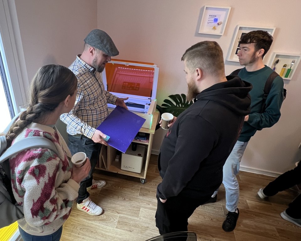 Wie das praktisch umzusetzen ist, davon konnten sich die Gäste bei einem Rundgang überzeugen. Dem Innovationslabor stehen unter anderem ein 3D-Drucker und ein Lasercutter zur Verfügung, die heute in Aktion zu erleben waren. Besonders der 3D-Drucker und die Möglichkeit, damit ganz individuelle Hilfsmittel zu produzieren, begeisterte alle.